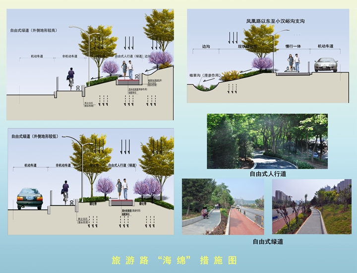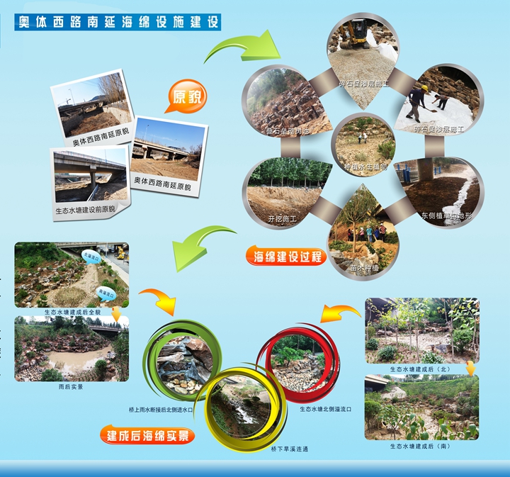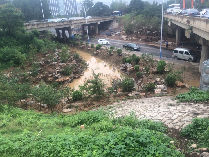 奧體西路南延原為斷頭路,道路紅線(xiàn)范圍及東西側(cè)空間原狀均為荒地,旅游路北橋北側(cè)原為大辛河支溝上游河道。結(jié)合本次奧體西路南延道路工程建設(shè),充分落實(shí)海綿城市建設(shè)理念,重點(diǎn)對(duì)橋下空間因地制宜進(jìn)行挖潛,精心設(shè)計(jì)建設(shè)了1500余平方的生態(tài)水塘、植草溝、旱溪等海綿工程設(shè)施。通過(guò)對(duì)旅游路部分路段雨水進(jìn)行斷接,使上游區(qū)域雨水先進(jìn)入生態(tài)水塘等設(shè)施進(jìn)行生態(tài)凈化和下滲,滲后多余的雨水再溢流進(jìn)入大辛河支溝,徹底改變了該路段原有的雨水直排模式。