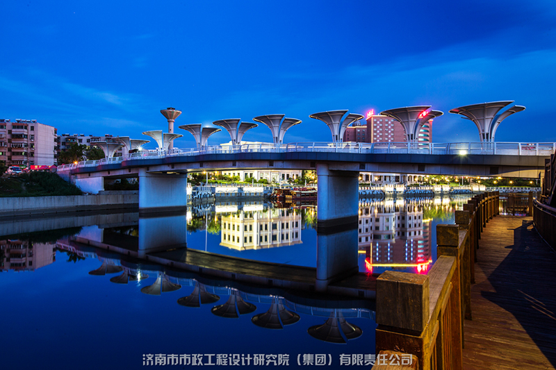 匯集了多種橋型,與小清河的自然環(huán)境、人文景觀有機(jī)地結(jié)合在一起,包括變截面連續(xù)梁橋、斜腿鋼構(gòu)橋、預(yù)應(yīng)力連續(xù)組合梁拱結(jié)構(gòu)、斜拉橋、中承式系桿拱橋等。在考慮結(jié)構(gòu)整體和交通功能的同時(shí),把握城市橋梁的景觀特性,做到工程和景觀的和諧統(tǒng)一。成為城市河道橋梁大量、有機(jī)結(jié)合的典范。